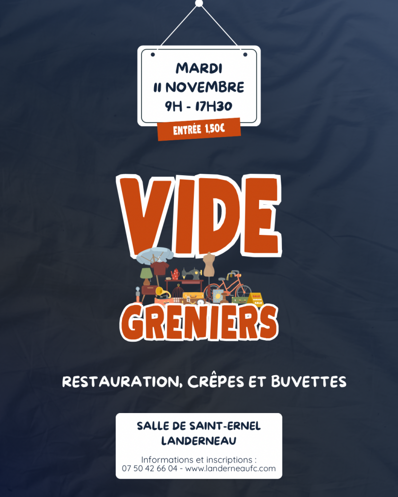 Comme chaque année, le Landerneau Football Club vous donne rendez-vous pour son traditionnel vide-greniers, le mardi 11 novembre prochain, de 9h à 17H30 dans la Salle de Saint-Ernel.
